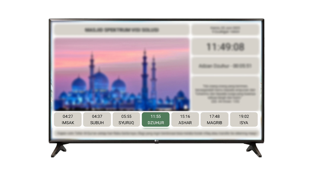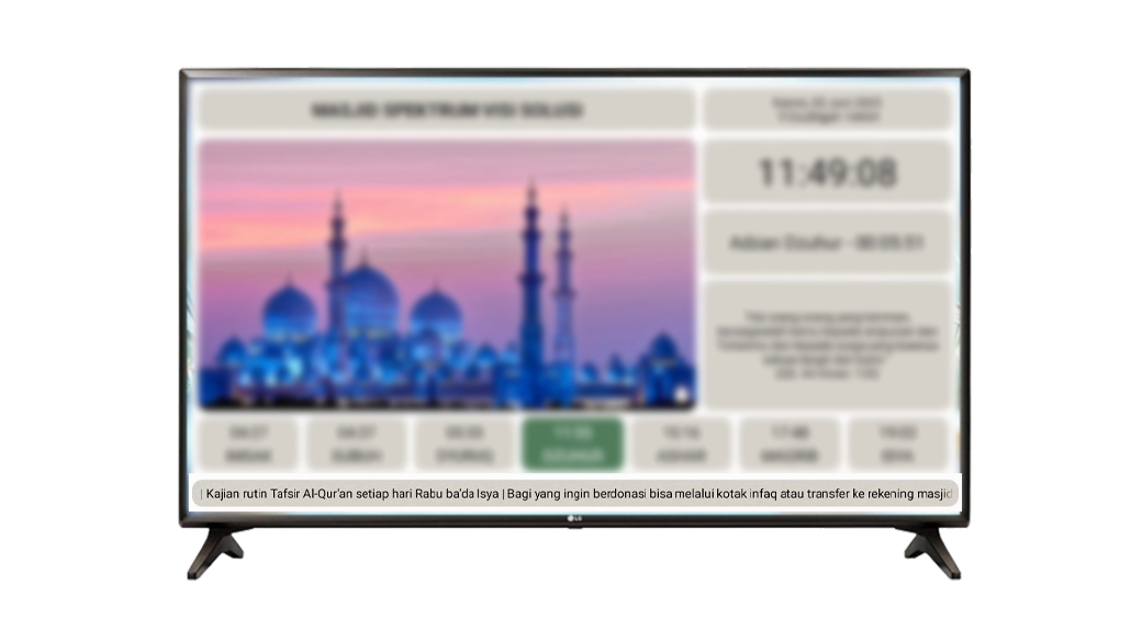 Menampilkan jadwal shalat, countdown iqamah, kutipan islami, pengumuman masjid, dan lainnya.
